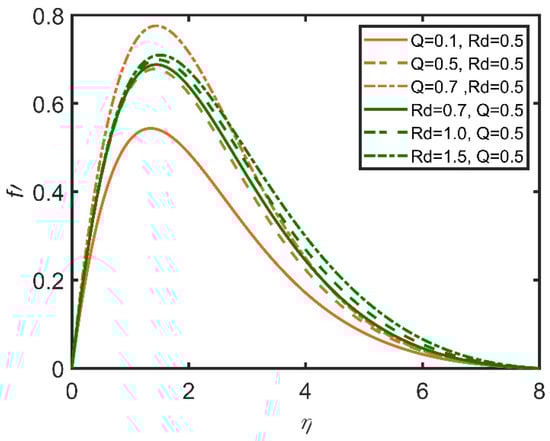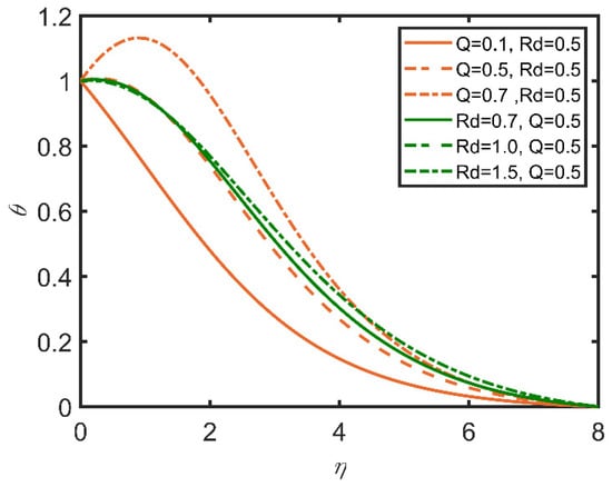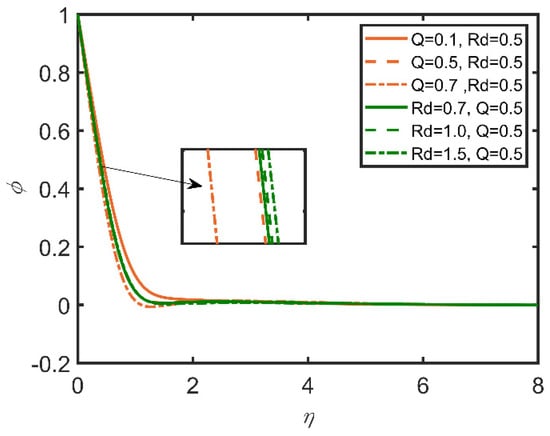 In Figure 15, Figure 16, Figure 17, Figure 18, Figure 19 and Figure 20, the comparisons of the heat generation and radiation parameters are reported. In Figure 15, skin friction increases with the increases in the heat generation effect and the radiation parameter. This effect is due to the increase in the temperature of the fluid caused by the increases in these parameters. The fluid becomes less dense, and the friction between the fluid and surface diminishes, so skin friction increases. The same trend can be seen for the Nusselt number by increasing heat generation in Figure 16; however, with the increase in radiation, the Nusselt number decreases, as the radiation parameter is related to the ambient temperature, so when radiation increases, the ambient temperature also increases; therefore, the rate of heat transfer flow from the fluid to the ambient temperature decreases. Hence, the Nusselt number decreases. In Figure 17, the Sherwood number decreases with the increase in heat generation, as the heat generation parameter is inversely related to the concentration of nanoparticles. Hence, the Sherwood number decreases. In Figure 18, the same can be observed, whereby the concentration profile decreases as heat generation increases. In Figure 19, the velocity profile increases as heat generation and radiation increase. This effect is due to the increases in heat generation and radiation, whereby the fluid becomes less dense, and the fluid flows easily. In Figure 20, it is obvious that with the increases in heat generation and radiation, the temperature profile increases, as it rises the temperature of the fluid. So, the temperature profile increases.