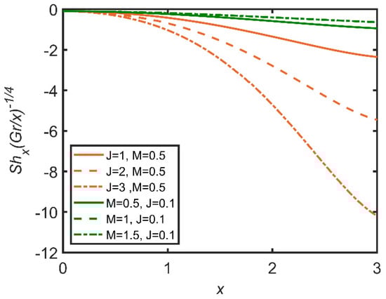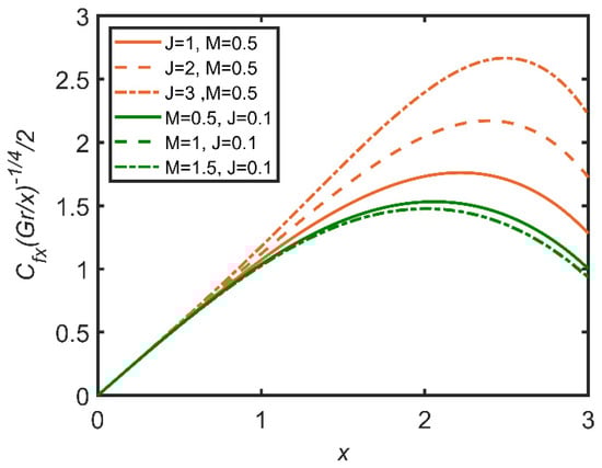 In Figure 21, Figure 22 and Figure 23, the comparisons of the effects of Joule heating and the magnetic parameter on the fluid are reported. In Figure 21, with the increase in Joule heating, skin friction increases. This effect is because Joule heating is inverse to the density of the fluid, so the fluid becomes frictionless as Joule heating increases. Moreover, the magnetic parameter lowers skin friction, because the magnetic parameter is directly related to density. Therefore, the greater the magnetic parameter is, the denser the fluid is, and the friction between the surface and the fluid layer becomes high. In Figure 22, the Joule heating effect enhances the Nusselt number, as it is inversely related to the concentration of nanoparticles as well as the temperature difference between the fluid and the ambient temperature; therefore, the rate of heat transfer becomes dominant. The opposite case is verified for the magnetic parameter, whose increase decreases the Nusselt number.