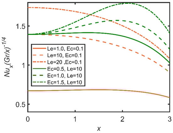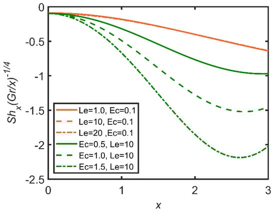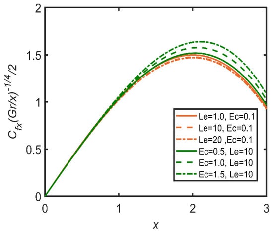 In Figure 24, Figure 25 and Figure 26, the comparisons of the Lewis number and Eckert number are reported with the help of graphs. In Figure 24, skin friction decreases with the increase in the Lewis number, as it is directly proportional to fluid viscosity. Therefore, the friction between the surface and the fluid increases as a result, as skin friction is enhanced by the increase in the Lewis number. Furthermore, the Eckert number enhances skin friction, as the Eckert number is directly related to the Grashof number of nanoparticles. So, the fluid flow becomes dense. Therefore, skin friction increases. In Figure 25, as the Lewis number is directly related to viscosity, the Nusselt number increases as the Lewis number and the Eckert number both increase, so the rate of heat transfer becomes easier. The Eckert number increases the Grashof number; therefore, the Nusselt number also increases. In Figure 26, the Sherwood number decreases as the Eckert number and the Lewis number increase.