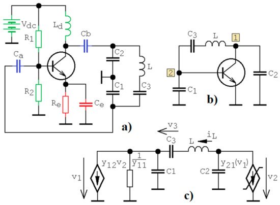 A mathematical model that describes the Clapp oscillator with a nonlinear model of the bipolar transistor (with output admittance removed) can be expressed accordingly to Figure 1c as