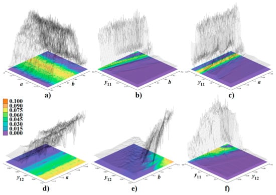 Rainbow-scaled surface-contour plot of the largest LE zoomed on the area around a set of parameters (12): (a) a vs. b, (b) y11 vs. b, (c) y11 vs. a, (d) y12 vs, a, (e) y12 vs. b, and (f) y11 vs. y12. Color scale provided on the left side corresponds to the largest LE.