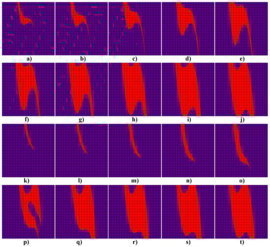 Basin of attraction for typical chaotic attractor visualized in v1 vs. v2 plane. State space slices are defined by iL = 0 A and the following planes: (a) v3 = −10 V, (b) v3 = −9 V, (c) v3 = −8 V, (d) v3 = −7 V, (e) v3 = −6 V, (f) v3 = −5 V, (g) v3 = −4 V, (h) v3 = −3 V, (i) v3 = −2 V, and (j) v3 = 0 V. Lower gallery deals with state space slices given by zero voltage v3 = 0 V and the following planes: (k) iL = −10 A, (l) iL = −9 A, (m) iL = −8 A, (n) iL = −7 A, (o) iL = −6 A, (p) iL = −5 A, (q) iL = −4 A, (r) iL = −3 A, (s) iL = −2 A, and (t) iL = −1 A.