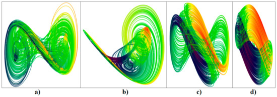 Figure 5 shows other interestingly shaped strange attractors discovered by the search-for-chaos routine (sizes of all attractors are comparable to the attractor in Figure 2). The initial conditions for Figure 5a,c were , and the numerical value of parameter a = −1 A3V−1 was kept for all plots. Individual numerically integrated trajectories have a rainbow color scale that represents growing inductor current. The final time was chosen as 1000 s and time step 10 ms. Note that the geometrical structures of the chaotic attractor given in Figure 5a,b are geometrically similar to the famous double-scroll and single-scroll, respectively, although this strange attractor is formed within the state space having four dimensions.