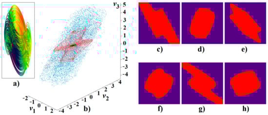 Clapp oscillator, Case II: (a) colored v1–v2–v3 plane projection of a typical strange attractor and (b) sensitivity of system solution to tiny changes of initial states, visualization of the final states after short (green points), average (red points), and long (blue dots) time evolution. Basins of attraction visualized using plane fragments: (c) v1—v2, (d) v1—v3, (e) v1—iL, (f) v2—v3, (g) v2—iL, and (h) v3—iL. Each subplot is calculated with uniform 0.01 step of the initial conditions (voltages or current) and with the rest of the initial conditions fixed on zero (voltages or current). See text for further details.