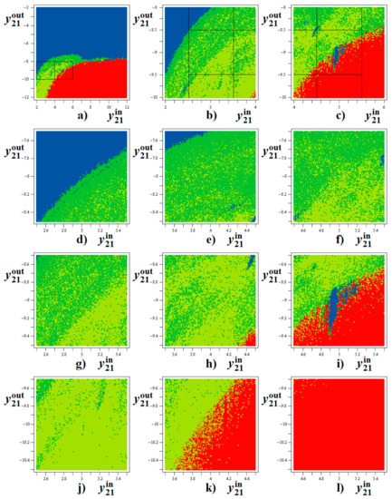 Clapp oscillator, Case II, rainbow-scaled surface plot of the KYD of hyperchaotic motion as function of PWL function shaping coefficients: (a) general view, (b,c) follow-up zoomed areas. Squared regions of parameters investigated in more details, with the slopes in both outer segments: (d–f) y21out ∈ (−8.5, −7.5) S, (g–i) y21out ∈ (−9.5, −8.5) S, and (j–l) y21out ∈ (−10.5, −9.5) S. Figure contains the colored legend that apply to all plots.