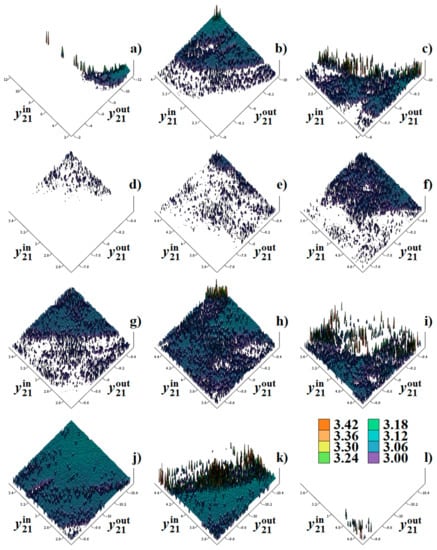 Figure 8 represents rainbow-scaled surface plots of KYD plotted with respect to the parameters of the PWL function (associated with the nonlinear forward trans-conductance y21). The missing surface means that the solution excited by the unstable equilibrium located at zero suddenly becomes unbounded. The analyzed fourth-order dynamical system exhibits hyperchaotic movement in a wide parameter range, the strongest two-dimensional state space expansion along the trajectory (in average) borders with the unbounded solution.
