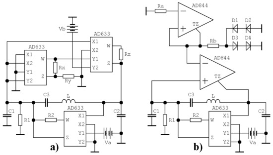 Note that both autonomous circuits given in Figure 9 are very simple and contain very few active elements. Moreover, a chaotic electronic system with a polynomial vector field was constructed by using only analog multipliers as active devices. Of course, this is not a new idea. The same approach can be found in much older papers, but it is still an up-to-date method, as evident from the recent brief study [34]. By adopting analog multipliers as trans-conductance cells, the final network topology is much simpler if compared with an analog computer concept. This will be evident also from the upcoming text.