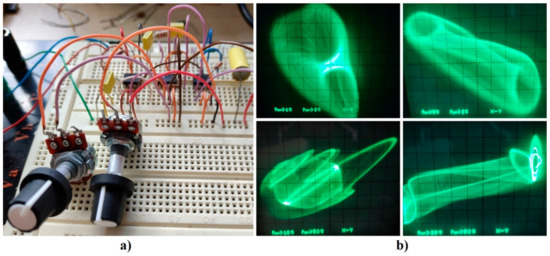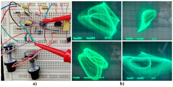 A few oscilloscope screenshots captured during the experimental verification of the designed Clapp oscillator, Case I (using bread board) are shown in Figure 10. Note that the external voltages can be used to change system behavior accordingly to Figure 3e, i.e., we can easily trace the route-to-chaos scenario in two parametric dimensions. A very good final agreement between theoretical shapes and practically observed strange attractors can be concluded.