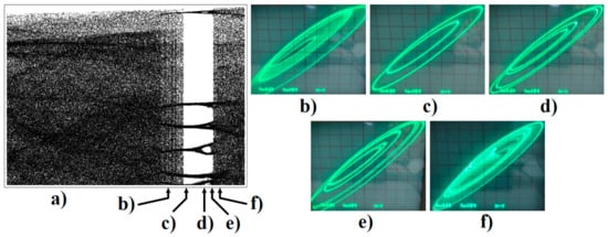 One-dimensional bifurcation diagram obtained by adjusting external voltage Vb in circuit schematic: (a) focused range Vb ∈ (4.8, 5) V. Plane projection of generated state attractors for values: (b) Vb = 4.88 V, (c) Vb = 4.92 V, (d) Vb = 4.96 V, (e) Vb = 4.98 V, and (f) Vb = 5 V.