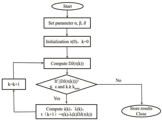 After taking into account the gradient of the cost functional in the above theorems, the next problem is to calculate the optimal switching time. In this subsection, the steepest descent algorithm with Armijo step sizes is explained in Figure 2. By denoting the initial parameters , and , the step size can be designed as .
