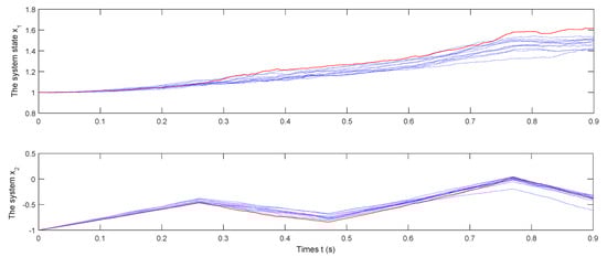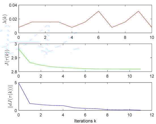 The optimal switching time is after ten iterations. Based on the proposed algorithm, we obtain the corresponding optimal cost . From Figure 3, it is easy to see that the cost J quickly converges to a minimum value and the gradient function reaches the termination value. In addition, the system state trajectories with respect to the switching time signal are illustrated in Figure 4.