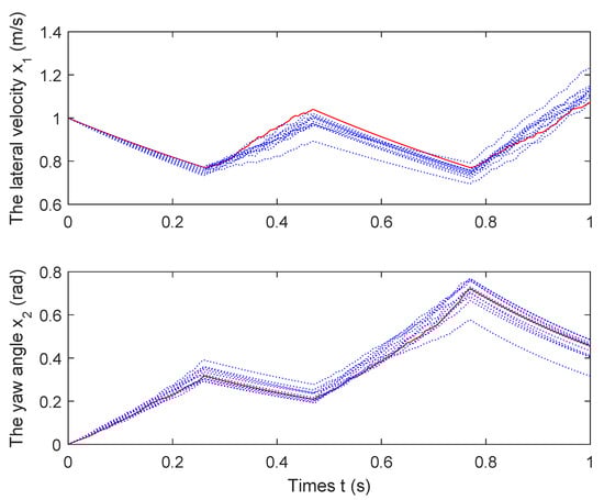 In this section, the four wheel drive autonomous mobile robot system and numerical example are proposed to prove the feasibility of the designed optimization fault tolerant algorithm. The dynamic model of the four wheel drive mobile robot system represented in reference [35] is subject to actuator faults. It is shown that even with external stochastic disturbance and unknown switch draft fault in the actuator switched mechanism, the proposed optimization fault tolerant algorithm can explain the safety switch control of the different trajectory tasks for the autonomous mobile robot.
