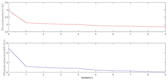 We select the initial state , the initial time , the final time , the initial switching time . The weight coefficient matrices are designed as , where I denotes the unit matrix. The cost function and the gradient function with k iterations and the trajectories of the states and are shown in Figure 5 and Figure 6 when employing the proposed optimal timing fault tolerant control strategy.