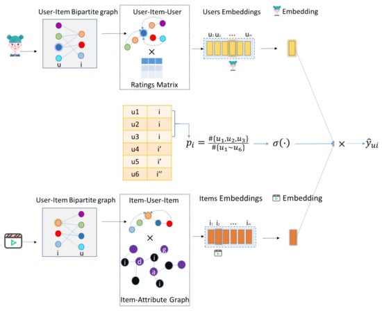 Note that the final obtained is a matrix whose every row represents a user’s feature vector after aggregating information about its own neighbors. Additionally, our task in the model of Figure 1 is to predict the ratings of specific users for specific items. Therefore, for a particular user u, we multiply its one-hot vector with to obtain the row vector representing user u in as the final representation of u, (see Equation (4)). will be involved in the subsequent computation of the interaction with the particular item.