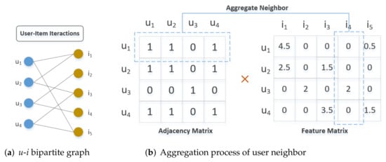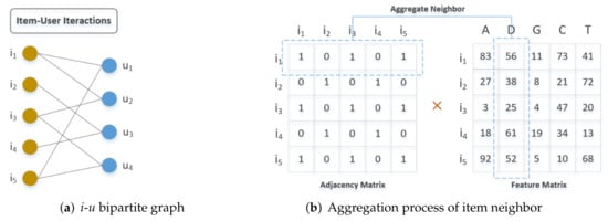 The item–user bipartite graph in Figure 5a and the user–item bipartite graph in Figure 4a are actually the same graph, representing the exact same user–item rating data. However, the two graphs are flipped exactly in position. Here, we are targeting the items, so we want to generate the adjacency matrix and feature matrix of the items, and thus aggregate the neighbors’ information about the items. In the following, we describe in detail the process of fusion of item features in Figure 5.
