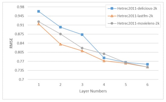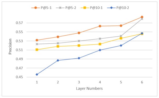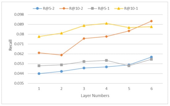 The success of deep learning stems from its "depth." EGCI is also a deep learning framework. Therefore, the number of layers of the network is undoubtedly a key hyperparameter of EGCI. In order to verify the influence of “depth” on EGCI, we successively have the multi-layer perceptron network of user–item interactions 1, 2, 3, 4, 5, or 6 layers for comparative experiments and analysis. The results of models with different layers are shown in Figure 6, Figure 7 and Figure 8. Note that in the legends in Figure 7 and Figure 8, because the dataset name is long, we use 1, 2, and 3 to represent hetrec2011-movielens-2k, hetrec2011-lastfm-2k, and hetrec2011-delicious-2k, respectively.