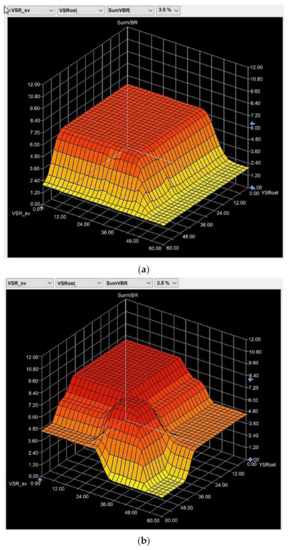 Figure 9 shows the block diagram of the constructed model, as well as Gaussian membership functions of VSRost (VSRsv similarly) and Cij and the output variable SumVBR. Gaussian fuzzification is most consistent with the stochastic version of the problem. The parameters of the Gaussian terms were determined according to the authors’ expert estimates based on their practical work with surveillance camera data.