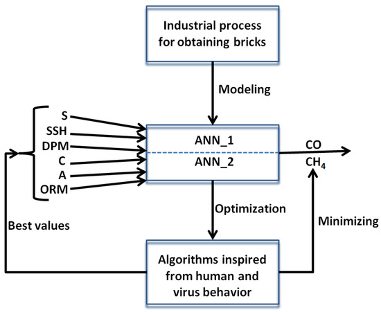 The main goal of this approach was to develop a complex, efficient methodology based on artificial intelligence tools for modeling and simulation. The methodology was applied on an industrial process, i.e., obtaining bricks from materials with different added ingredients, aiming to streamline the process. In this respect, artificial neural networks proved to be good models. Thus, for the prediction of CO emissions, the best model was ANN(6:20:16:1) with MSE = 0.0128, r2 = 0.959 and Ep = 2.19%; while for CH4, the ANN(6:30:18:1) model gave values of MSE = 0.0085, r2 = 0.973 and Ep = 9.59%. The neural models were integrated into an optimization procedure solved with different algorithms inspired by human behavior (learning, cooperation and competition) and virus behavior. For the same value of the objective function, the algorithms give different results for the 6 decision variables, which is a real advantage in practice, allowing the user to choose the most convenient solution.