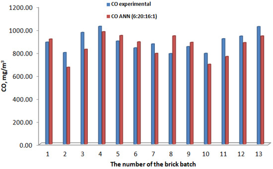 Neural models built to assess the impacts of the addition of auxiliary materials (sawdust and sunflower seed husks) on the amounts of exhaust gases in the furnace chimney in an industrial brick-making plant offer the possibility of making predictions that can help to reduce the number of test batches, with significant savings in time and money. Even if the mean square deviations are slightly larger than what other authors report in the literature [51,52,53,54,55,56], it must be taken into account that the modeled data are obtained experimentally in an industrial installation where the flow of gases discharged to the furnace chimney is of about 40,000 m3/h. In order to evaluate the influence of composition and density on the compressive strength of AAC lightweight brick, Zulkifli et al. [51] obtained a correlation coefficient of 0.984 in the training stage for the neural models with feed-forward backpropagation architecture and the Levenberg–Marquardt training algorithm. Recently, Shaban et al. [54] proposed on adaptive neuro-fuzzy inference system (ANFIS) with particle swarm optimization (PSO) to predict the compressive strength of concrete aggregate bricks (BACs). The correlation coefficient obtained in the training stage was 0.955. The importance of the study by Shaban et al. [54] derives from the fact that built models can help reduce demolition and construction (D&C) wastes and support efficient construction management. Members of our research group obtained correlation coefficients higher than 0.999 in the training stage for the neural models with feed-forward backpropagation architecture when modeling the thermal stability of some materials [56].