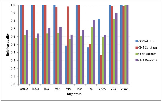 We also have good results reflected by values of 1 for CO and CH4 provided by SHLO, TLBO and ICA, but with longer execution times (lower values for the following two bars). Other information provided by the figure shows unacceptable results for CO and CH4 given by VPL, VS and VlOA and short execution times (values of 1 for bars 3 and 4) corresponding to the VrOA and VCS algorithms.