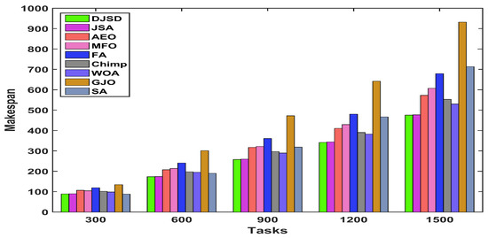 The comparisons of experimental outcomes in terms of the average makespan produced by DJSD, JSA, AEO, MFO, FA, Chimp, WOA, GJO, and SA for the synthetic and real workload traces are given in Figure 7, Figure 8 and Figure 9. In comparison to the traditional JSA and other peer algorithms, the suggested DJSD approach generates the best average makespan for the synthetic workload, as demonstrated in Figure 7. Besides that, when the NASA iPSC workload is employed, Figure 8 shows that DJSD delivers better average makespan values than other peer algorithms. In addition, when considering the HPC2N workload, Figure 9 shows that DJSD attains lower average makespan values compared to existing algorithms. Ultimately, the reported results reveal that DJSD exhibits the best average makespan among the other eight comparative methods for all investigated instances.