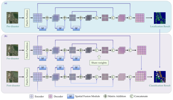 - According to whether pre-disaster or post-disaster remote sensing images are used, building damage assessment methods can be divided into the following two categories: (1) methods that use only post-disaster images; and (2) methods that use both pre-disaster and post-disaster images. For post-disaster image-based methods, damage assessment is usually conducted by image segmentation [14]. However, the outlines of buildings in post-disaster images may be blurred by the strike of disaster, and the characteristic of the buildings often changes dramatically. Collapsed buildings lose their regular geometric shapes, where the regular texture feature distribution does not apply, resulting in building assessment errors. For the above problems, if pre-disaster image of intact buildings is available and used, it can help locate the damaged parts of buildings [15]. In [16], a two-stage framework is proposed for damage detection from both pre-disaster and post-disaster images. The networks of two stages share the same weight and are responsible for building localization and damage classification, respectively. In this paper, we design our network mainly based on this idea.