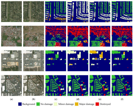 - First, with the process of urbanization, it is important to assess urban disaster-affected areas. However, it is still difficult to comprehensively assess the damage of the multi-story buildings for our proposed framework. The information of a building from the satellite image is limited to roofs, while damages on walls cannot be effectively detected. In some cases, these tall buildings are projected into irregular shapes due to the satellite imaging angle, and the sides of the buildings are shown in the satellite images, which may lead to ambiguity of the network. In addition, the shadows of the buildings may change with the satellite acquisition time. However, in the xBD dataset, most of the building objects are low buildings, which weakens the model’s ability to detect tall buildings.