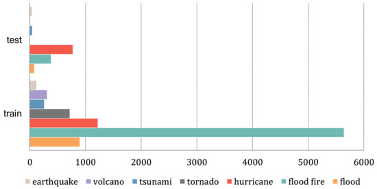 - Second, the training samples are imbalanced in terms of damage levels and the disaster categories, as shown in Table 2 and Figure 12. The imbalanced training set may affect the training process of the network. Due to the difficulty in acquiring paired high-resolution pre-disaster and post-disaster remote sensing images, the xBD dataset is the first building damage assessment dataset with high-quality annotations. Therefore, it requires a large amount of work to expand the size of the building damage assessment dataset.