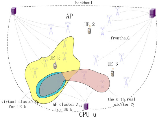 Compared with traditional small cell systems, CF-M-MIMO systems have made changes in the way of serving the UE. Unlike small cell systems in that each UE is served by only one AP, CF-M-MIMO systems allow the CPU to connect multiple APs for digital beamforming [11], which provides coordinated transmission for several UEs on the same time-frequency resource. Early studies have shown that appropriate signal processing methods, such as regularized zero-forcing (RZF) or minimum mean-squared error (MMSE) precoding in the downlink, can be used separately at each CPU to suppress the interference from other APs connected to the same CPU [18,19,20], rather than cooperate with other CPUs.