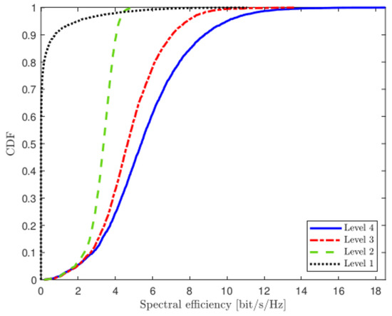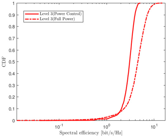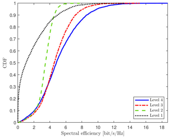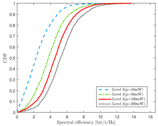 Figure 7 plots the CDF of the SEs of Level 3 when varying the uplink transmit power for . Although Level 3 can deal with the interference that comes from UEs, it is greatly affected by the uplink transmit power. The result shows that the performance of Level 3 decreases with the degrades in uplink transmit power.