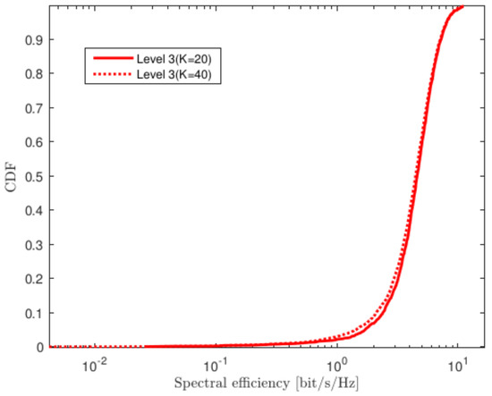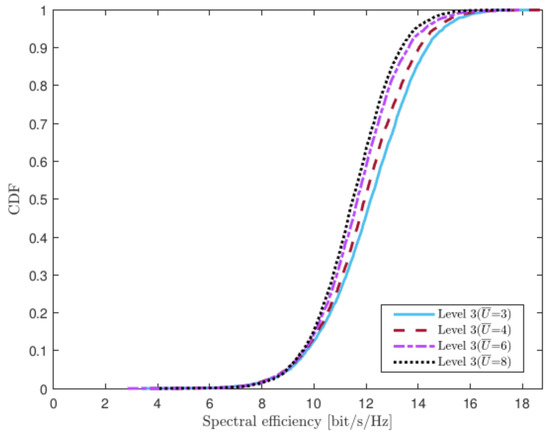 Figure 6 demonstrates the CDF of the SEs of Level 3 under different numbers of UEs. As can be shown in Figure 6, we can see that the performance of Level 3 only slightly degrades as more UEs are served. It indicates that Level 3 can effectively suppress the interference coming from more UEs.