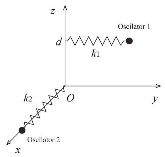 There are three typical molecular models for the research on the nonlinearity of chiral molecules: the spiral single electron model is used for the chiral molecules with a helical micro-structure or their valence electron moving along the helical path [6,7]; the two-coupled-oscillator model is described as two charged oscillators moving orthogonally on two parallel planes at a certain distance and having an elastic weak coupling interaction [8,9,10]; the three-coupled-oscillator model refers to a tripod-like structure composed of a chiral center and three different groups that can be regarded as spring oscillators [11]. Scholars have investigated the nonlinear effects of these three models in terms of polarizability, hyperpolarizability and second harmonic generation. As for the two-coupled-oscillator model, Yin et al. realized its exact plasmonic analog through experiments and adjusted the vertical distance between corner-stacked gold nanorods to discuss the excitation mode [9]. Gui et al. studied the third-harmonic circular dichroism of a typical oscillator model by means of chiral plasmonic metasurfaces and explored the nonlinear chiroptical response of such chiral structures [12]. From the deeper perspective of physics, the two-coupled-oscillator model in the optics of chiral molecules is commonly discussed regarding light transmission through dense solutions and dense ordered aggregates of chiral DNA molecules. The manifestation of this model can be understood, as the DNA base tends to assemble into pairs through hydrogen bonds and is interconnected into a double helix structure. Considering the interactions between groups, the attachment points allow for a more compact and solid packing through rotating [13]. Moreover, the various states of strand coupling and strand separation, deformation and compaction in the DNA make the study of this model interesting [14,15]. It is widely used to describe and rationalize the dynamics of the DNA and other structures with the same properties. We strive to provide useful references for the further exploration of chiral molecules in various fields, and our research might pave the way toward nonlinear dynamics of a two-coupled-oscillator system evolving with time, including analyzing the stability and discussing the periodic motion state.