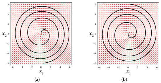 In order to verify the validity of theoretical analysis and discuss the trajectory distribution near the equilibrium point, we numerically analyze the four-dimensional average equation to acquire stable and unstable trajectories. As shown in Figure 2a, we can see that the trajectory is a counterclockwise spiral line around point . It gradually tends to the equilibrium point from the initial point in helical form from outside to inside and reaches a stable state. As shown in Figure 2b, the trajectory is also a helix line that rotates counterclockwise and surrounds equilibrium point . Nevertheless, the difference is that the trajectory gradually moves away from inside to outside, and it is in an unstable state. Therefore, the equilibrium point is determined as the focus. Figure 3 shows the phase portraits of the plane in different intervals of stable and unstable regions. The plane is similar. This perceives the movement trend and orientation of the system more intuitively.