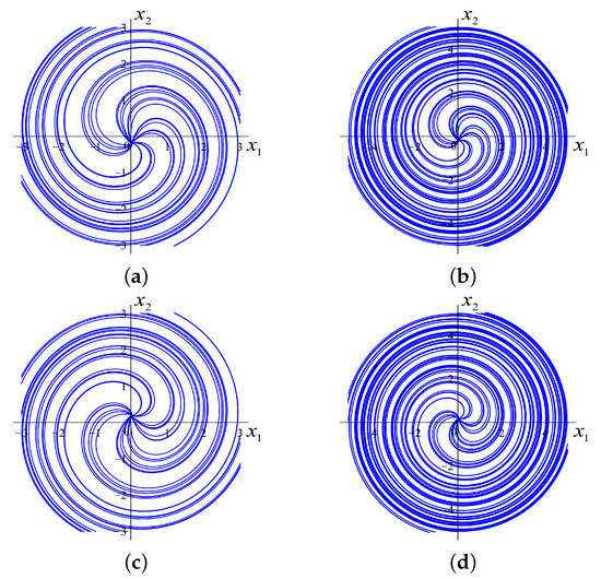Phase portraits of plane: (a) Stable region (); (b) Stable region ); (c) Unstable region (); (d) Unstable region ().