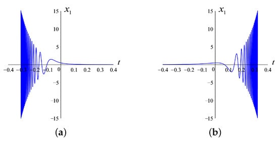 By drawing the time series graphs, we can observe the overall change in trend of elastic oscillators under the action of internal resonance factors for a long time and show the non-stationary variation, such as waves fluctuation. As shown in Figure 4, in Figure 4a tends to zero with time t increasing, that is, it approaches the equilibrium point and appears as peaks or troughs alternately. Figure 4b shows the trend and direction of over time in the unstable region. With the increase in time t, the vibration amplitude presents a continuous rise, fall or no change in the same nature, and the change amplitude may be different. The time series graphs further verify the one-to-one correspondence between time and phase portraits. This section only presents part of the graphs; other direction or plane graphs can be obtained similarly through the four-dimensional nonlinear average equation.