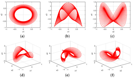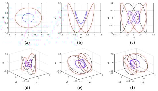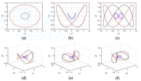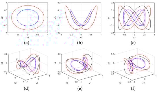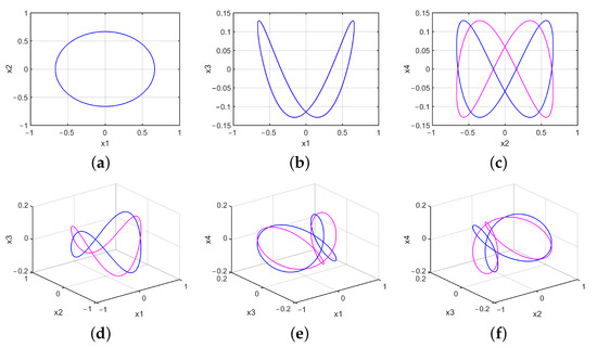 Figure 6 demonstrates the morphology and relative positions of periodic orbits for the system. The periodic orbits have a bigger amplitude and the periodic orbits have a smaller amplitude. Figure 6a–c denote the phase portraits of periodic orbits projected on two-dimensional planes. It can be seen that the projections of two pairs of periodic orbits and coincide in the same pair on the , , and planes. Figure 6d–f show the phase portraits of periodic orbits projected in a three-dimensional space. Furthermore, the moving morphology of the periodic orbit in is a one-to-one correspondence with that in .