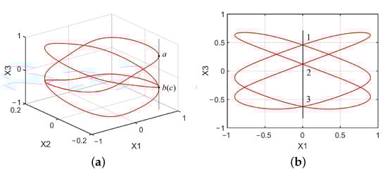 From the data sheets and scatter plots, we can know the specific value of corresponding to the occurrence of multiple periodic motion. In the following, we analyze the motion state of the system according to the plane and three-dimensional phase portraits of periodic motions with different multiples. Taking periodic-3 motion of as an example (as shown in Figure 13), the phase portrait in the coordinate is composed of circling and closed trajectories. We take a point a as the initial point on the track, and reach the point b on the same vertical line when rotating around the trajectory for one week. Similarly, when rotating the third circle, the moving point on the trajectory will return to the initial point a, which is triple periodic motion. It can be found from the plane phase portrait that, when the vertical line on the axis moves to the intersection of two lines (only in the case of an intersection), three intersections will appear (as shown in Figure 13b), that is, the triple periodic motion is explained again. The planar and three-dimensional phase portraits for other cases of parameters and are shown in Appendix A. These graphs can help to understand the meaning of multiple periodic motion more comprehensively.