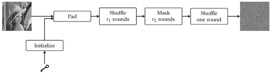 The purpose of this phase is to increase the security level of the proposed scheme against some attack models such as chosen-plain image attacks by padding the input plain image. Given a plain image P of size , the preprocessing phase uses a randomized padding scheme to construct the padded plain image of size , where for some random number satisfying the condition that can be reshaped into an almost square matrix I. We call an matrix almost square, if . As this increased security comes at the cost of extra processing and storage needed for cipher images, the value of should not be too large, and typically would be satisfactory.