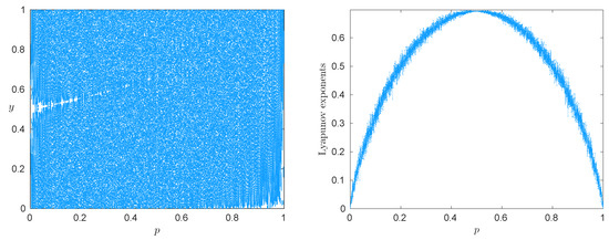 where and p are the initial state and control parameter for the map, respectively. For , Equation (5) has a positive Lyapunov exponent, and hence it exhibits chaotic behavior [42,43]. Figure 3 depicts the bifurcation diagram of Equation (5) and its Lyapunov exponents. Thus, given any initial state and control parameter , successive iterations of Equation (5) generate an infinite sequence of real numbers uniformly distributed in .