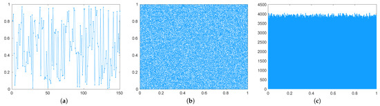 In this paper, we propose a probabilistic image encryption scheme based on a number of chained chaotic quadratic and skew-tent maps as its chaotic engine. The proposed chaining method increases the keyspace and hence the security level of the proposed image encryption scheme. Algorithm 2 presents the chaining algorithm. Throughout this paper, we refer to any execution of this chain as Rule C. Sequences generated according to Rule C are used to permute the rows and columns of the matrix representing the input plain image. We further use this rule to generate sequences of integers in , obtained by mapping sequences generated by Rule C, to mask the entries of the shuffled image. Therefore, it is essential to measure the randomness of the proposed chaining algorithm. Figure 4a depicts a time series plot of a sequence generated according to Rule C, whereas Figure 4b depicts a plot of the points where 125,000. Furthermore, Figure 4c depicts the histogram of . It is evident that the entries of s are unpredictable and uniformly distributed in the interval .
