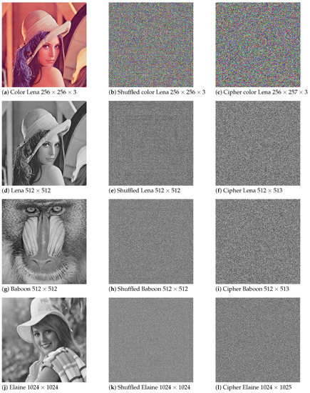 To showcase the efficiency of the proposed image encryption scheme, we subject a number of test images, including a blank image, to the permutation phase and masking phase of the proposed encryption scheme with (no padding). Figure 5 depicts the plain images and their corresponding shuffled images and cipher images. The cipher image corresponding to the blank image of size appears random, hence we omit it. Throughout this paper the number of rounds in Algorithm 3 are and .
