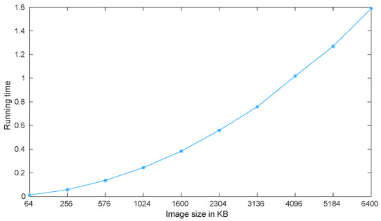 This section reports the running speed of the proposed image encryption scheme. Table 2 reports the running times for generating cipher images corresponding to plain images of different sizes. These results are obtained using MATLAB R2021b on a desktop machine with an Intel® Core™ i5-8500 processor and 8 GB of memory, running Windows 10. Furthermore, Figure 6 depicts the running times for encrypting plain images of different sizes using the proposed scheme.
