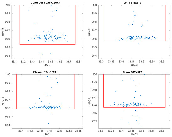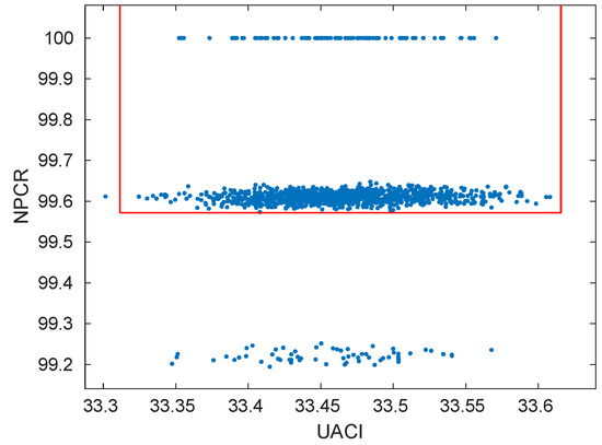 The NPCR and UACI measures of pairs of cipher images corresponding to the Lena image generated by the proposed scheme using the same secret key.
