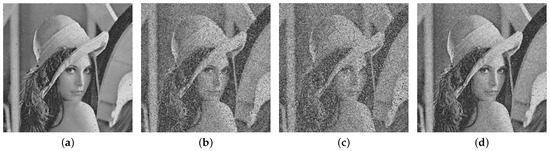 Reconstructed Lena after subjecting its corresponding cipher image to (a) 10% salt and pepper noise, (b) 2% speckle noise, (c) Gaussian noise with mean 0 and variance , and (d) Poisson noise.