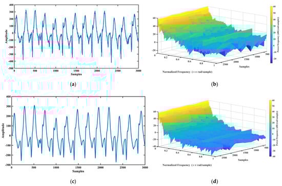 Figure 1 shows an ECG signal that has undergone the smoothing operation. Figure 1a shows the raw ECG signal with the domain of −500 mV to 400 mV. Figure 1b shows the 3D spectrogram of this raw signal. Figure 1c manifests the smoothed signal with a domain of −300 mV to 300 mV. Additionally, Figure 1d shows the spectrogram of the smooth signal, which revealed that the higher frequencies are decreased in it. The pre-processing will be quite effective in reducing the complexity of the model through the normalization of the numbers.