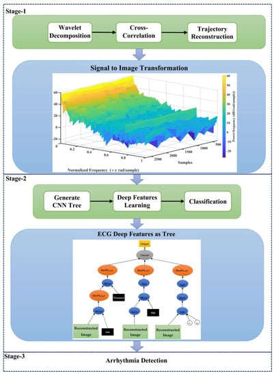 The flowchart of the proposed method is shown in Figure 2. The innovation of the proposed method to diagnosis arrhythmia using the ECG signal of individuals is based on drawing a trajectory as a figure for each 12-ECG signal leads. Since the ECG signal is periodic, frequency analysis on it can give useful information about this signal. For this, frequency analysis was performed using the wavelet packet transform on each of the 12-ECG signal leads. Then, cross-correlation was calculated between leads 1 to 12 to describe relations between various leads. To extract the ECG signal trajectory, a repetitive pre-processing was calculated on 12 cross-correlation signals, and their spectrogram was extracted. Finally, a trajectory was drawn for these 12 signals, and the output of the trajectory was saved as a figure. These figures are used to produce features as input to the CNN tree. The CNN tree is then developed based on the GP paradigm.