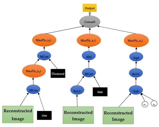 Table 1 shows the set of functions used in the CNN tree. First, the functions used to change the numerical space of the features include convolution (Conv), square root (SQRT), addition (ADD), rectified linear unit (ReLU), subtraction (Sub), and absolute (Abs), among which Conv is the most important function. This function is responsible for applying the morphological operators to the input ECG signals. On account of their special geometrical characteristics, the morphological functions, such as dilation and erosion, are capable of perfectly analyzing the complexities of ECG signals, including QRS complex. The morphological operators, such as erosion and dilation, are beneficial for analyzing the shape-oriented signals due to their theoretical framework and lower computational complexity [,]. The morphological operators, i.e., erosion and dilation, are the restricted form of counter-harmonic mean morphology [].