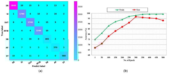 The confusion matrix of the proposed fusion algorithm with all ECG 12 leads and its convergence rate curve, (a) confusion matrix, (b) convergence rate curve.