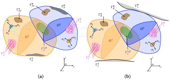 The contact problem between two 3D thermoelastic isotropic bodies () under quasistatic thermoelastic contact conditions with a piecewise smooth boundary , in a Cartesian coordinate system (see Figure 2). The mechanical and thermal boundary conditions are defined using two partitions of . The thermal partition is divided into four disjoint parts: , on which the temperature is imposed, with heat flux prescribed, on which forced convection conditions are imposed and , which is defined as the potential contact zone. The mechanical partition is: , being the traction assumed on , the elastic displacements prescribed on , elastic retention mechanism modeled by means of Winkler elastic supports prescribed on with K known and , which is defined as the potential contact zone.