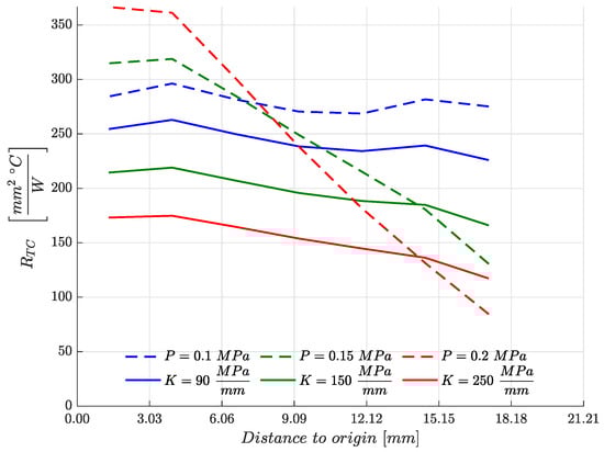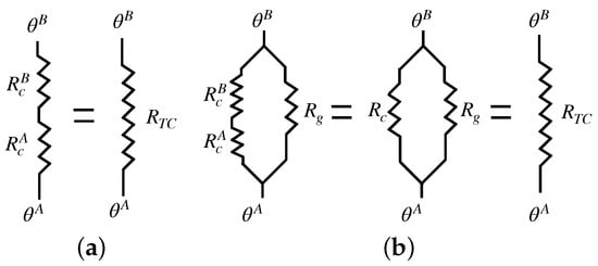 Once thermal contact conductance is obtained from Equation (8), the thermal contact resistance is modeled in Figure 3a and calculated as: